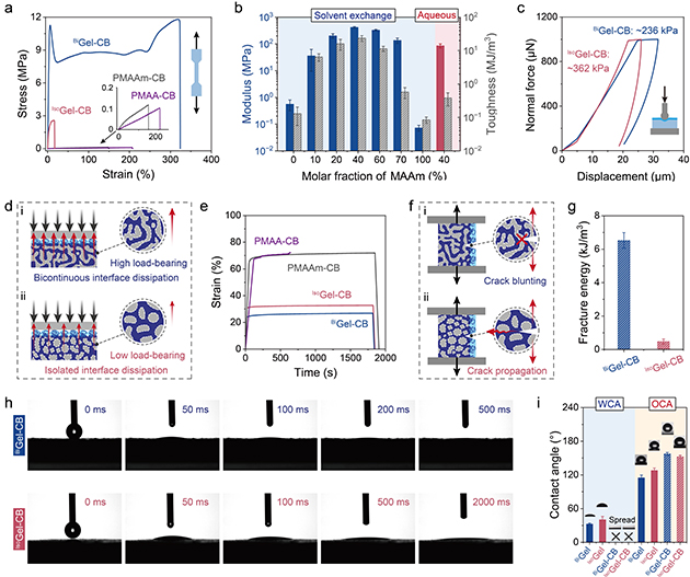 圖3. (a) 不同水凝膠的單軸拉伸應(yīng)力-應(yīng)變曲線。(b) 楊氏模量和韌性與MAAm含量的關(guān)系。(c) 表面納米壓痕測試曲線。(d) 抗蠕變性能測試示意圖及(e)蠕變曲線。(f) 純剪切測試示意圖及(g)斷裂能結(jié)果。(h) 水滴在BiGel-CB和IsoGel-CB表面的動(dòng)態(tài)鋪展過程。(i)?超親水及水下超疏油性能評(píng)估。