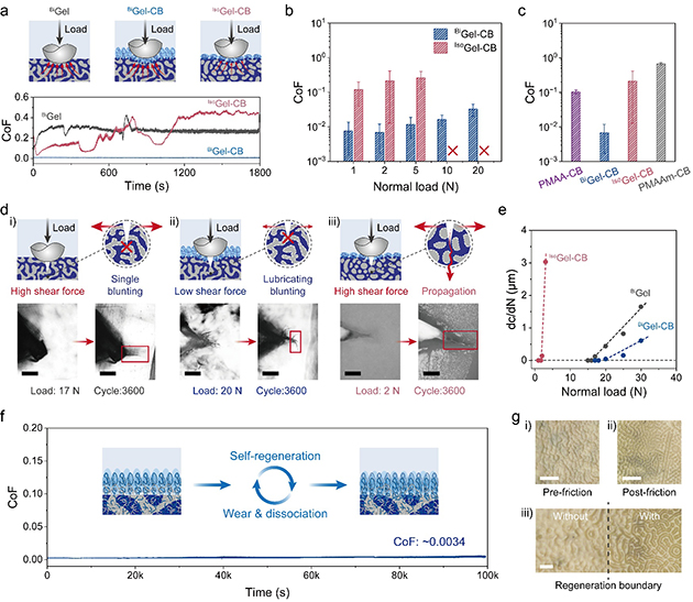 圖5.(a) 摩擦測試示意圖及BiGel、BiGel-CB和IsoGel-CB對(duì)應(yīng)的摩擦系數(shù)曲線。(b)?BiGel-CB和IsoGel-CB摩擦系數(shù)隨載荷的變化。(c) PMAA-CB、BiGel-CB、PMAAm-CB和IsoGel-CB樣品的平均摩擦系數(shù)。(d) 摩擦裂紋擴(kuò)展示意圖及 i)?BiGel, ii)?BiGel-CB, iii)?IsoGel-CB的裂紋光學(xué)圖像(比例尺:200 μm)。(e)?BiGel、BiGel-CB和IsoGel-CB的界面裂紋擴(kuò)展速率隨載荷的變化。(f)?BiGel-CB在50 N法向載荷下的長期潤滑性能。(g)?BiGel-CB在PBS溶液中摩擦測試前后的表面光學(xué)圖像:i) 摩擦前,ii) 摩擦后,iii) 摩擦邊界(比例尺:200 μm)。