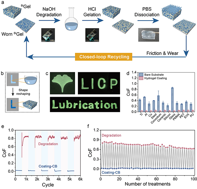 圖6.(a) 魯棒潤滑系統(tǒng)的閉環(huán)回收示意圖。(b) 形狀重塑過程示意圖。(c) 制造的不同形狀水凝膠圖案(銀杏葉、研究所徽章“LICP”、文字“Lubrication”)。(d) 水凝膠涂層與相應(yīng)裸基底摩擦系數(shù)的對(duì)比。(e) 降解-重建循環(huán)過程中的摩擦系數(shù)曲線及(f)平均摩擦系數(shù)值對(duì)比(以玻璃為基底,“處理次數(shù)”以奇數(shù)次代表涂層、偶數(shù)次代表降解來表征)。