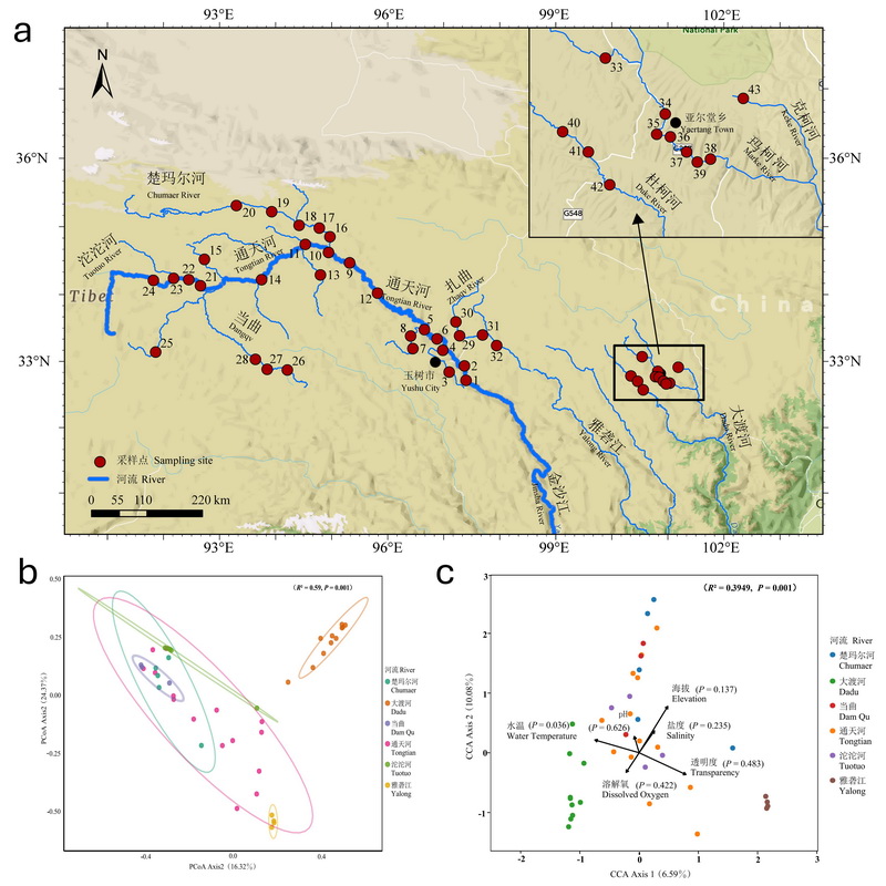長江源區(qū)位于青藏高原腹地,海拔普遍在4,500–6,000 m之間,是我國重要的高寒水源涵養(yǎng)區(qū),也是全球生物多樣性熱點地區(qū)之一。為厘清長江源區(qū)魚類分布與多樣性格局,中國科學院西北高原生物研究所動物生態(tài)與資源保護研究團隊對通天河、沱沱河、楚瑪爾河、當曲以及雅礱江源、大渡河源等開展調查,2021–2022年共設置43個樣點,記錄到魚類26種(亞種),隸屬2目3科12屬,并較歷史調查新增7個分布記錄(其中土著4種、外來3種)。相對重要性指數顯示優(yōu)勢種集中于軟刺裸裂尻魚和小頭高原魚;α多樣性結果提示通天河與大渡河物種多樣性較高,而雅礱江物種均勻度較低。進一步的CCA置換檢驗表明整體模型顯著(P=0.001,R2=0.3949),水溫對魚類分布影響最為突出,海拔影響接近顯著;熱點分析識別出通天河與大渡河存在95%置信度的物種聚集熱點。該研究為長江源區(qū)魚類保護與外來物種風險管理提供了關鍵本底數據。