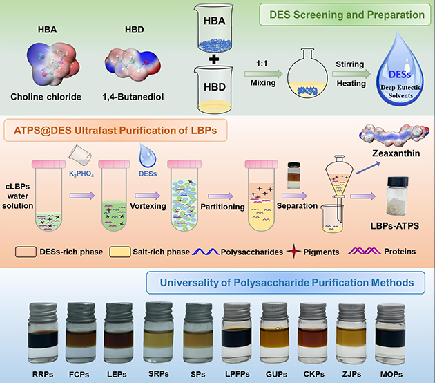 高效、精準(zhǔn)的分離純化是開展多糖精細(xì)結(jié)構(gòu)解析和活性研究的重大難題,而樣品前處理是多糖分離純化的重要基礎(chǔ)和前提。傳統(tǒng)多糖分離純化的樣品前處理技術(shù)包括脫脂、脫蛋白和脫色等過程,不僅操作繁雜、時間冗長,而且會導(dǎo)致多糖流失、結(jié)構(gòu)變化和活性失活等。針對上述問題,課題組提出了將低共熔溶劑(Deep Eutectic Solvents,DES)引入雙水相體系(Aqueous Two-Phase System,ATPS)的新思路,構(gòu)建了新型ATPS@DES多糖樣品前處理新體系,實(shí)現(xiàn)了枸杞多糖同步脫脂、脫蛋白和脫色;同時,在此溫和、綠色的條件下,實(shí)現(xiàn)了枸杞多糖高保留率和最大程度保持多糖的原始結(jié)構(gòu)特征。