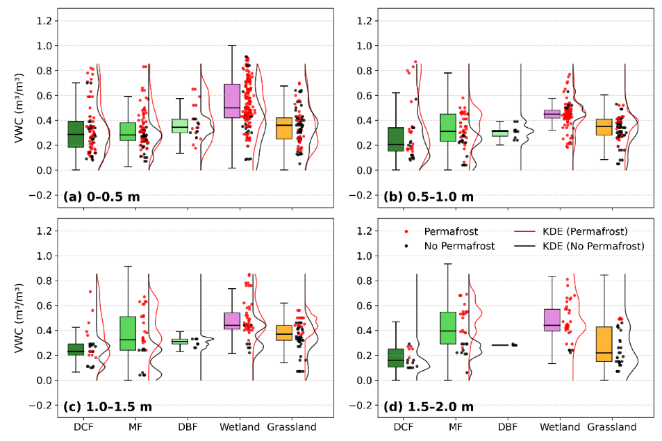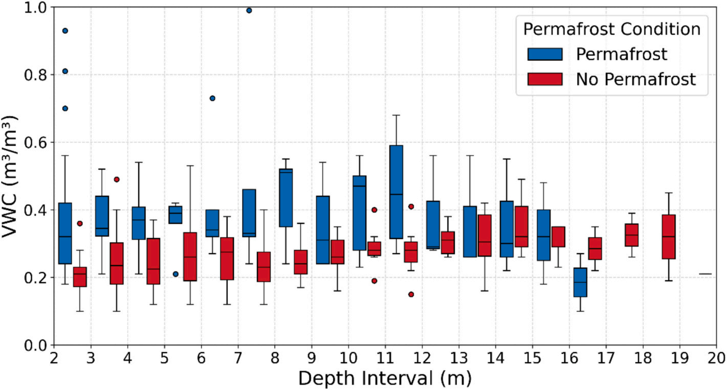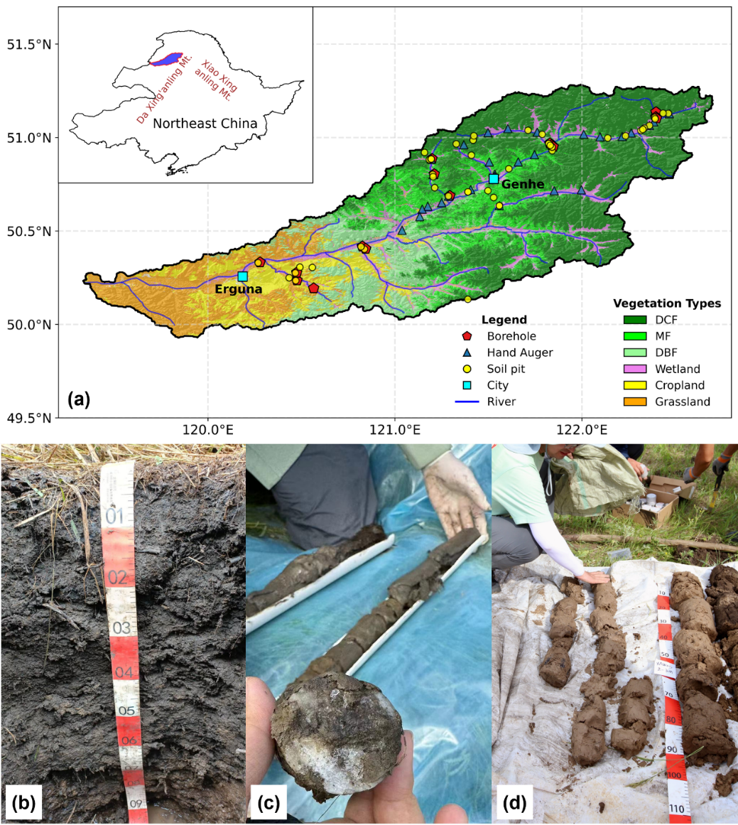 研究團隊在根河流域布設75個淺層土壤剖面和15個深達20米的鉆孔,獲取了覆蓋森林、草地、濕地等不同下墊面的土壤含水量觀測數(shù)據(jù)。并結合可解釋機器學習與結構方程模型,系統(tǒng)揭示了邊緣多年凍土區(qū)土壤水分的“垂向分層”特征及其控制機制。