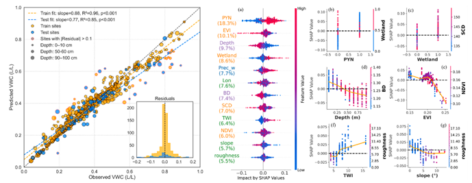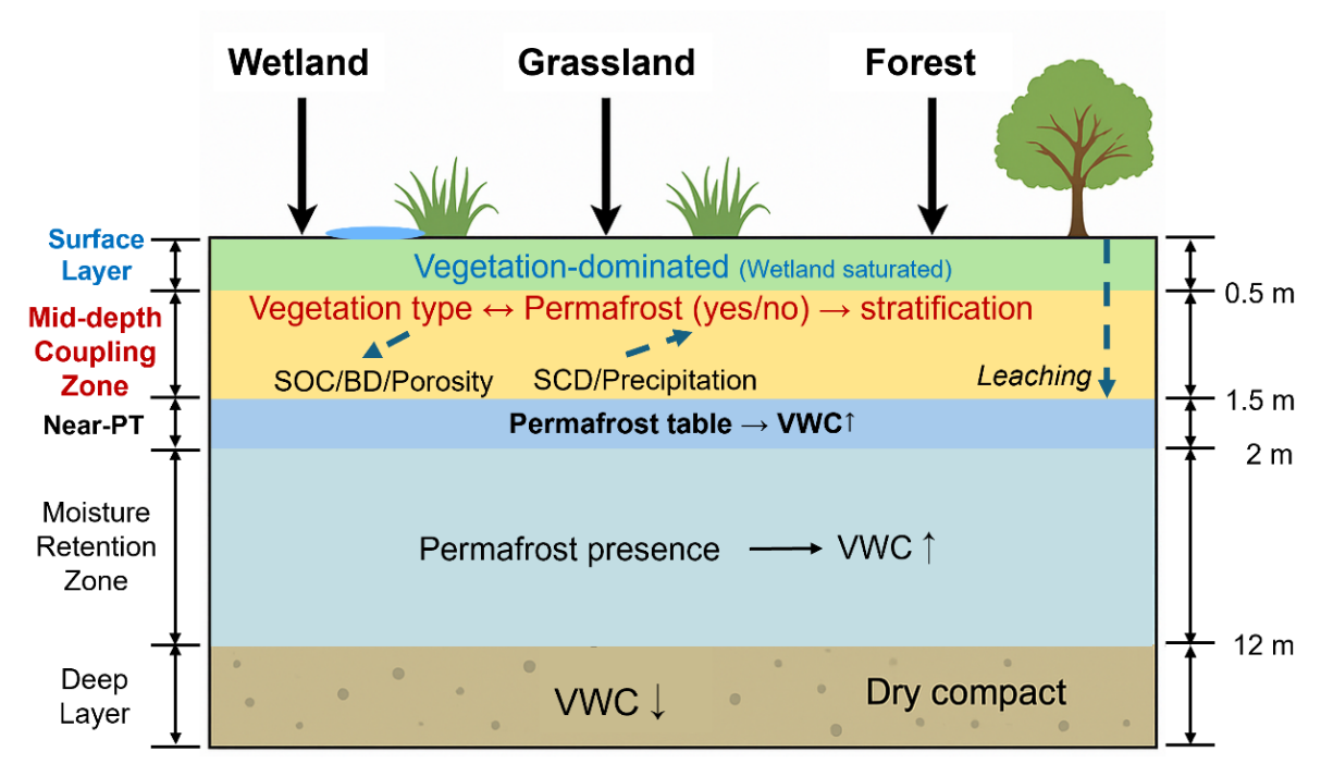 研究結果顯示,濕地覆蓋、土壤有機碳等地表與土壤屬性主導了淺層水分分布,土壤容重和多年凍土分布控制了深層蓄水與水分維持。氣候因子則主要通過改變地表溫度條件與凍融過程,間接影響水分結構與分層格局。