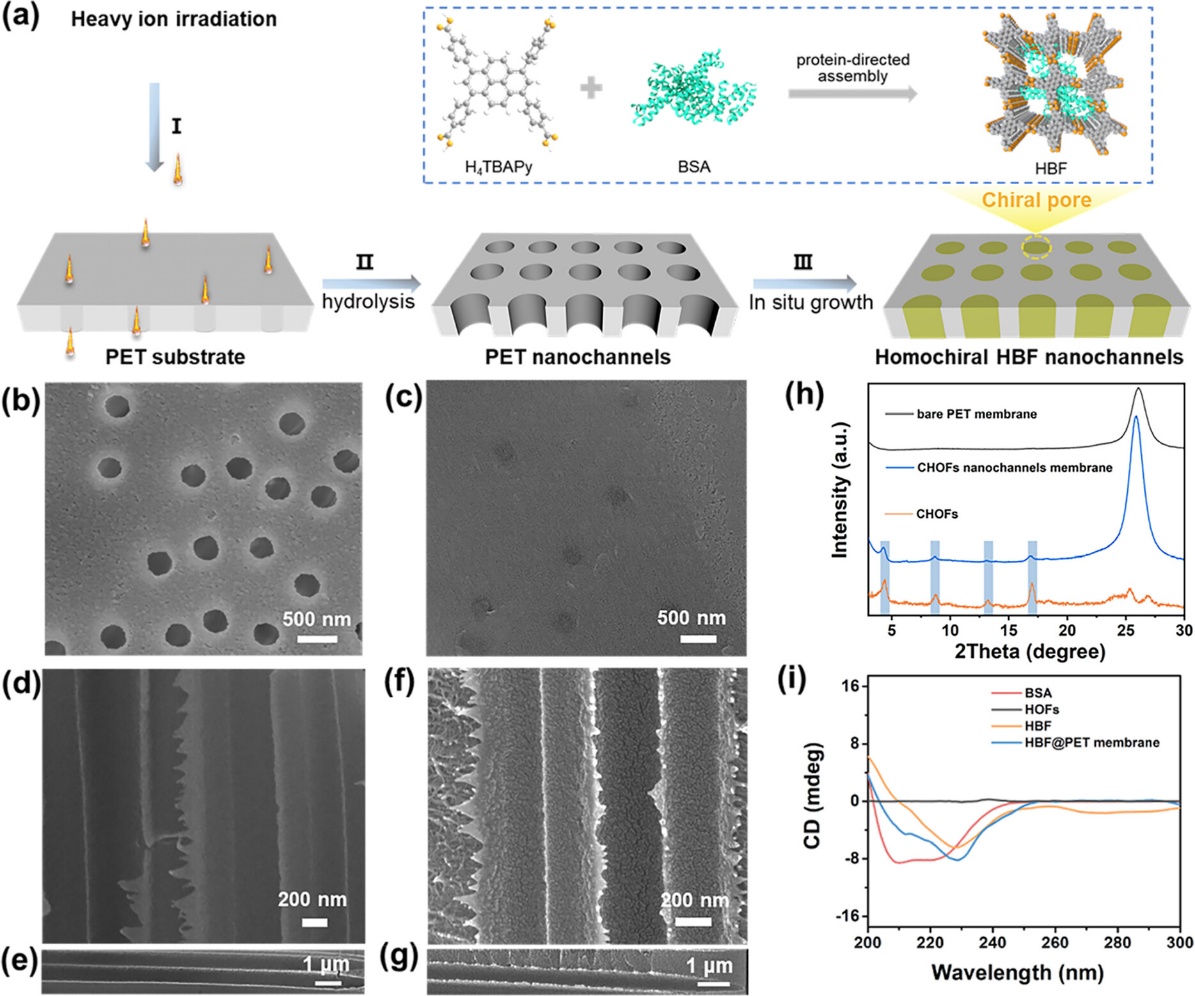 在此研究基礎(chǔ)上,研究團隊創(chuàng)新性提出一種電壓驅(qū)動的原位組裝策略:在2 伏直流電壓驅(qū)動下,帶負電的牛血清白蛋白(BSA)和有機配體分子(HTBAPy)通過電泳作用高效進入PET核孔膜的納米通道內(nèi)并實現(xiàn)均勻分布。BSA與配體通過定向氫鍵共組裝,形成氫鍵生物雜化框架(HBF)。該結(jié)構(gòu)既保留了BSA的天然手性微環(huán)境,又獲得氫鍵有機框架的結(jié)構(gòu)穩(wěn)定性。分析表征表明,HBF沿通道內(nèi)壁形成連續(xù)晶態(tài)層,使通道孔徑縮小至約1.5納米,與氨基酸分子尺寸相當,顯著增強了膜材料的手性識別能力。