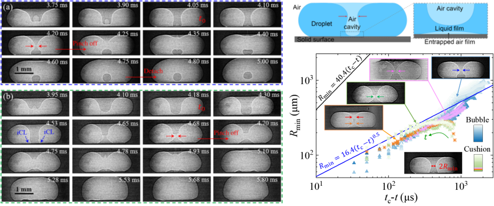 固液界面相互作用涉及典型的多尺度界面現(xiàn)象與流動(dòng)過(guò)程,液滴撞擊固體表面時(shí)會(huì)沿中心軸產(chǎn)生圓柱形氣腔,并在液滴下方捕獲一層空氣薄膜。傳統(tǒng)觀點(diǎn)認(rèn)為這層氣膜在影響撞擊結(jié)果中起關(guān)鍵作用。之前的研究?jī)H發(fā)現(xiàn)慣性主導(dǎo)的軸向內(nèi)爆導(dǎo)致氣腔夾斷并演化為氣泡,而對(duì)不形成氣泡的情況并不清楚,對(duì)氣腔與氣膜的相互作用也不了解。由于動(dòng)態(tài)液滴中存在多個(gè)液氣界面和復(fù)雜的構(gòu)型變化,傳統(tǒng)光學(xué)成像方法無(wú)法深入解析多界面動(dòng)力學(xué)。
