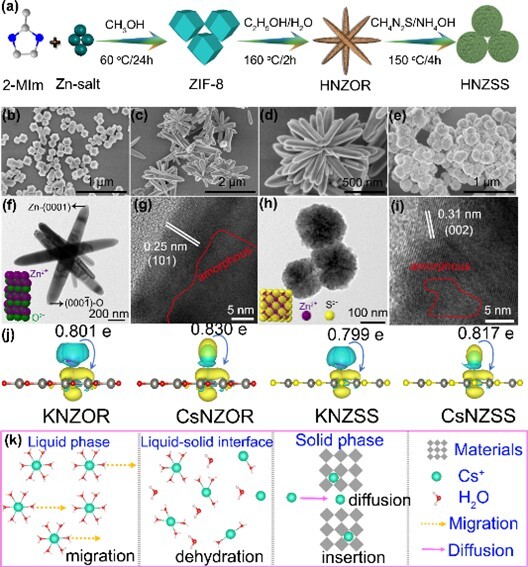基于上述策略,將十二面體ZIF-8定向轉(zhuǎn)化為無碳氮摻雜氧化鋅棒(HNZOR),并進(jìn)一步將其轉(zhuǎn)化為硫化鋅球(HNZSS)。與傳統(tǒng)煅燒方法相比,該方法有效抑制了金屬團(tuán)聚,充分暴露活性位點(diǎn),并形成了具有高表面積的非晶區(qū)域(HNZOR為203.9 m2/g,HNZSS為61.7 m2/g)。這些特性協(xié)同增強(qiáng)了傳質(zhì)能力,并在吸附劑骨架中形成強(qiáng)結(jié)合力,從而實(shí)現(xiàn)了優(yōu)異的吸附性能。K?活化后的吸附劑(KNZOR和KZNSS)展現(xiàn)出快速吸附動(dòng)力學(xué)和高吸附容量(分別為275 mg/g和302 mg/g),克服了競(jìng)爭(zhēng)離子干擾,在復(fù)雜環(huán)境中對(duì)Cs?具有優(yōu)異的選擇性。在實(shí)際水樣中,它們表現(xiàn)出卓越的吸附效率,KNZOR和KZNSS的分配系數(shù)(Kd)分別達(dá)到2061.85 mL/g和2578.31 mL/g。在實(shí)際柱操作中,KNZOR和KZNSS在連續(xù)流條件下可實(shí)現(xiàn)近定量(約99%)的Cs?回收。研究結(jié)果以“In-situ sequential topotactic transformation of ZIF-8 to N-doped Zn-oxide/ sulfide with defect engineering for efficient radiocesium capture” 為題發(fā)表于Chem. Eng. J.(一區(qū)TOP)。