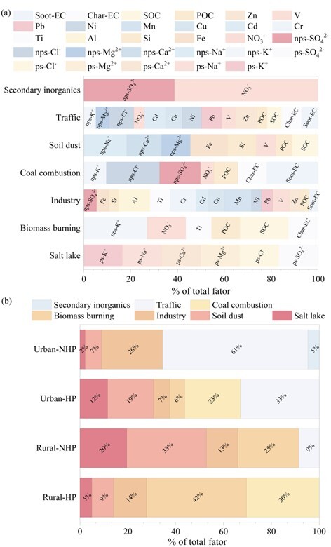針對這一問題,中國科學(xué)院青海鹽湖研究所相關(guān)研究團隊于2020年1月至2023年3月在柴達木盆地南部6個監(jiān)測點持續(xù)開展月度大氣降塵采樣。結(jié)果表明,柴達木盆地南部大氣降塵的化學(xué)組成呈現(xiàn)明顯鹽塵影響特征,鄉(xiāng)村地區(qū)鹽湖來源離子貢獻較高,表明鹽湖裸露地表和周邊鹽漬化土壤是區(qū)域重要自然塵源;碳質(zhì)組分分析進一步發(fā)現(xiàn),供暖期有機碳、元素碳及char/soot比值明顯升高,反映出固體燃料燃燒排放增強。源解析結(jié)果顯示,非供暖期降塵主要受交通排放和土壤揚塵影響,供暖期則主要受煤炭和生物質(zhì)燃燒影響;其中,鹽塵對鄉(xiāng)村地區(qū)非供暖期降塵貢獻較為顯著。總體來看,供暖活動不僅增強了碳質(zhì)組分排放,還可能通過改變局地氣象條件并疊加道路揚塵、除冰鹽使用等人類活動,與鹽湖和土壤揚塵共同影響區(qū)域降塵組成。