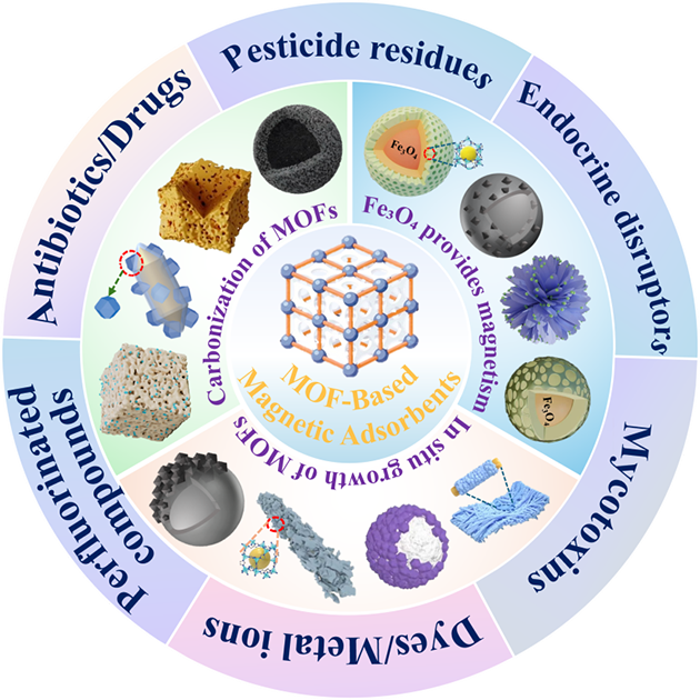 中國科學院蘭州化學物理研究所天然藥物與化學測量研究中心色譜材料與分離測量課題組長期聚焦西部資源能源復雜體系分離分析領域的新材料研發(fā)與新方法學構建,研發(fā)出多種功能化有機框架復合材料,應用于環(huán)境和食品中各類污染物的萃取富集與吸附去除研究(Analytica Chimica Acta, 2024, 1287: 342112;Microchimica Acta, 2024, 191(2): 90;Environmental Research, 2025, 264: 120319; ACS Applied Polymer Materials, 2025,7,5737-5746; Separation and Purification Technology, 2026, 394, 137454.),為環(huán)境監(jiān)測與食品安全評估提供了重要的技術支撐?;谠诖判訫OF基吸附材料研究中的積累,發(fā)表了關于磁性MOF基復合材料吸附污染物的研究進展的綜述文章。