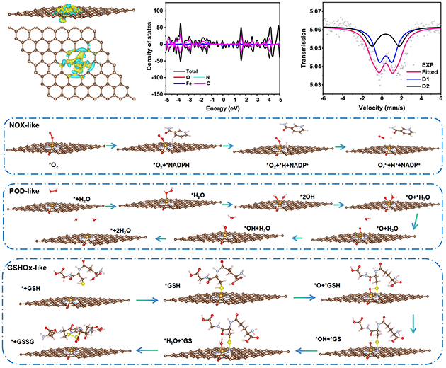 近日,中國(guó)科學(xué)院蘭州化學(xué)物理研究所天然藥物與化學(xué)測(cè)量研究中心海軍研究員團(tuán)隊(duì),發(fā)展了一種以氧化石墨烯為二維支撐載體的Fe單原子納米酶(FeNC SAzymes)。與傳統(tǒng)平面Fe-N4構(gòu)型相比,軸向O配位的引入有效打破了對(duì)稱配位限制,增強(qiáng)了活性中心的電子調(diào)控能力(圖1)。此外,密度泛函理論計(jì)算解析該關(guān)鍵活性能有效降低多酶反應(yīng)途徑的能量勢(shì)壘,從而提升NOX、POD和GSHOx等多酶樣級(jí)聯(lián)相關(guān)過程的反應(yīng)效率,為后續(xù)觸發(fā)后放大效應(yīng)提供基礎(chǔ)(圖2)。FeNC SAzymes結(jié)構(gòu)設(shè)計(jì)使Fe中心的電荷分布和d軌道電子態(tài)密度得到優(yōu)化,從而提升其對(duì)反應(yīng)中間體的吸附與活化能力以及電子轉(zhuǎn)移效率,為實(shí)現(xiàn)TME識(shí)別、可視化檢測(cè)和響應(yīng)研究提供了新方法。