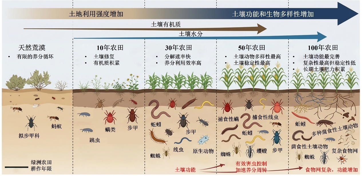 研究發(fā)現(xiàn),與荒漠相比,干旱區(qū)灌溉農(nóng)田的土壤動物多樣性大幅提升,土壤動物功能也會隨著年限的增加而增多,但長期耕作及撂荒均會對土壤動物多樣性及其功能產(chǎn)生負(fù)面影響,進而影響土壤健康與穩(wěn)定。