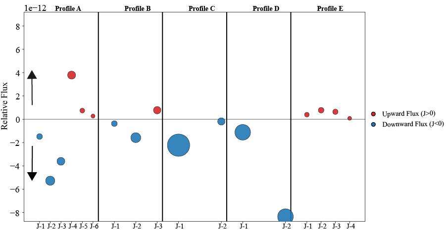多年凍土剖面中HCBD遷移的垂直分布。圖中顏色表示HCBD的遷移方向(藍色向上,紅色向下),圓圈大小反映遷移強度。