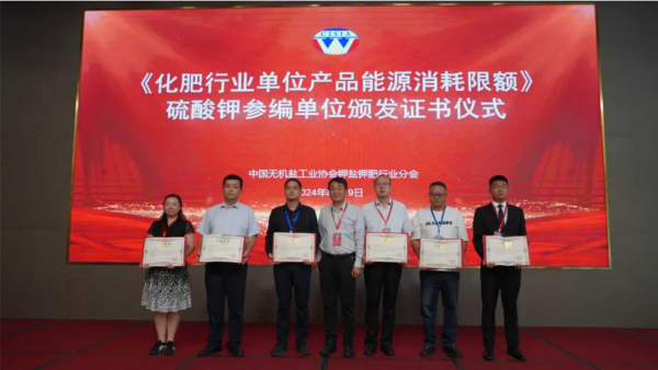 會(huì)議期間,還進(jìn)行了《化肥行業(yè)單位產(chǎn)品能源消耗限額》(《化肥行業(yè)單位產(chǎn)品能源消耗限額》(GB21344)是2023年11月最新發(fā)布的化肥行業(yè)為數(shù)不多的強(qiáng)制性國(guó)家標(biāo)準(zhǔn))硫酸鉀參編單位頒發(fā)證書儀式,青海鹽湖所作為參編單位,獲標(biāo)準(zhǔn)參編單位證書。