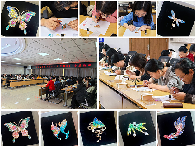 3月13日下午,組織開(kāi)展了“指尖傳非遺”點(diǎn)翠DIY活動(dòng)。培訓(xùn)老師向大家介紹了中國(guó)點(diǎn)翠工藝非物質(zhì)文化遺產(chǎn)的歷史底蘊(yùn)和文化價(jià)值,詳細(xì)講解了點(diǎn)翠胸針的制作過(guò)程。涂抹亮油、貼貝殼碎片、表面封層、定型……一片片細(xì)小的螺鈿片鑲嵌在胚底,斑斕色彩流動(dòng)交融,鮮活生動(dòng)?;顒?dòng)帶大家品味了傳統(tǒng)工藝的浪漫、領(lǐng)略了沉淀千年的藝術(shù)瑰寶。