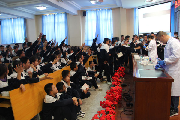 在校園,青海鹽湖所的博士科普團隊為中學(xué)生們講述了鹽湖故事,在《中國的鹽湖》科普講座中,形象生動地講述了“什么是鹽湖”“鹽湖在哪里”“鹽湖里有什么用”,使同學(xué)們對青海的特色優(yōu)勢鹽湖資源有了初步的認(rèn)識;開展了神奇的化學(xué)小實驗,通過多彩化學(xué)、密碼顯形、黃金雨、催化放氧、銅樹銀枝、銀鏡反應(yīng)等一系列精彩的科普實驗,緊緊抓住“變化”這一核心,以極具震撼力的方式向同學(xué)們展示了化學(xué)之美和科學(xué)之美,為同學(xué)們開啟科學(xué)世界的大門,激起他們探索科學(xué)世界的興趣;醫(yī)療專家為同學(xué)們現(xiàn)場普及家庭急救知識和新冠疫情預(yù)防知識,現(xiàn)場演示了心肺復(fù)蘇方法、正確的洗手方法及注意事項。無論是小實驗還是急救現(xiàn)場演示,同學(xué)們踴躍主動,興致勃勃,教室里不時發(fā)出陣陣驚嘆聲和掌聲,活動取得了圓滿成功。