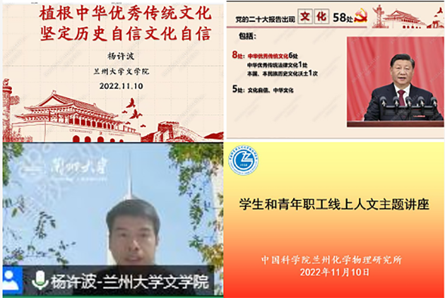 為深入貫徹落實(shí)黨的二十大精神,進(jìn)一步教育引導(dǎo)廣大研究生和青年職工堅(jiān)定文化自信,弘揚(yáng)中華優(yōu)秀傳統(tǒng)文化,11月10日,中國(guó)科學(xué)院蘭州化學(xué)物理研究所舉辦了研究生和青年職工線上人文主題講座。全所研究生、課題生和青年職工430余人參加講座。